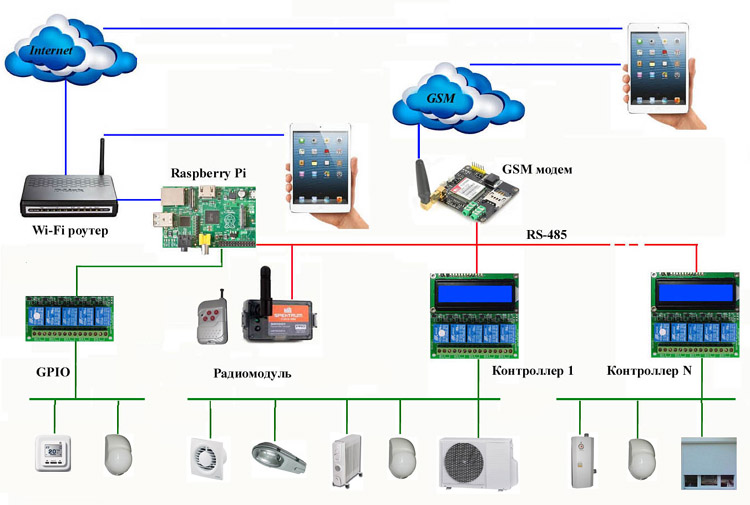 Cổng nối tiếp UART Raspberry Pi thông qua một thiết bị phù hợp thông qua giao diện RS485 kết nối các bộ điều khiển với một bộ đầu vào / đầu ra khác nhau. Ngoài ra, modem GSM có thể được kết nối với RS485 để truy cập hệ thống thông qua mạng điện thoại di động hoặc điện thoại cố định trong trường hợp không có cách nào để truy cập Internet tại điểm đặt người dùng. Truy cập vào hệ thống trong trường hợp này cũng được thực hiện bằng cách nhập mật khẩu.