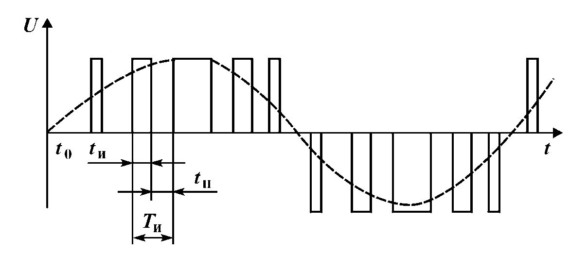 Hình vẽ cho thấy một PWM lưỡng cực. Tín hiệu hình chữ nhật là tín hiệu điều khiển trên các bóng bán dẫn từ bộ điều khiển, đường chấm chấm hiển thị dạng điện áp trong tải của các phím này - điện áp hiệu dụng.