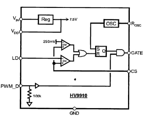Chip IC thứ hai, loại HV9910, là bộ ổn định dòng điện cho đèn LED siêu sáng. Sử dụng một bóng bán dẫn MOSFET bên ngoài, dòng điện có thể được đặt trong phạm vi từ một vài milliamp đến 1A. Dòng điện này được đặt bởi điện trở R3 trong mạch hồi tiếp. Con chip này có sẵn trong SO-8 (LG) và SO-16 (NG). Sự xuất hiện của nó được hiển thị trong Hình 4 và trong Hình 5 một sơ đồ khối.