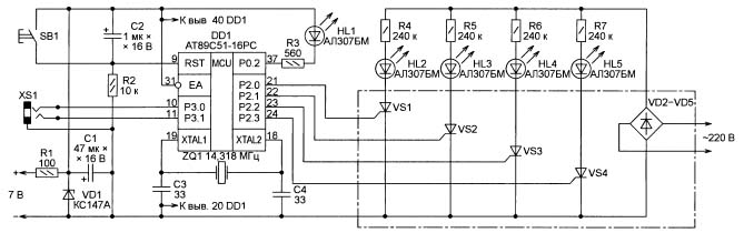 Ở phía bên phải của vi điều khiển có các đầu ra điều khiển thyristor và một nút điều khiển, được mô tả ở trên. Các thyristor bật vào thời điểm khi một mức cao xuất hiện ở đầu ra tương ứng của MK, sau đó vòng hoa tương ứng sáng lên.